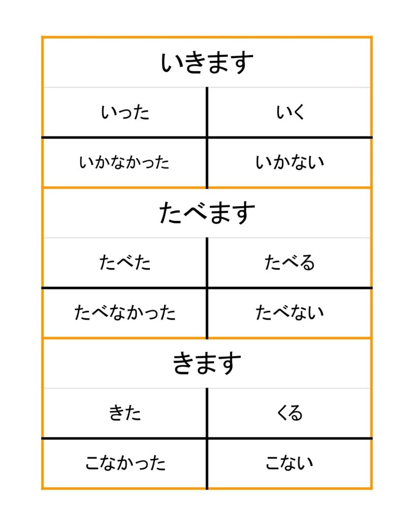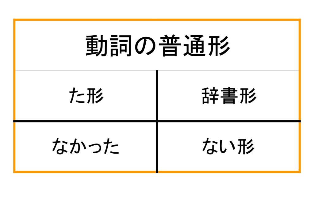 動詞の普通形は【「辞書形、た形、ない形」+なかった】の4つです。